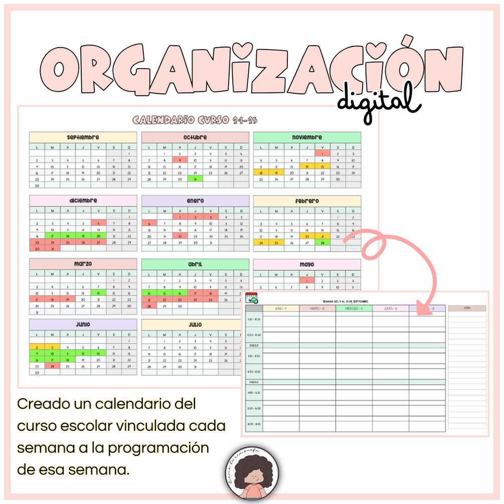 Archivo que consta de un documento en formato NUMBERS con una página con el calendario escolar la cual, cada lunes está vinculado con una página en la que puedes escribir y organizar tus sesiones.